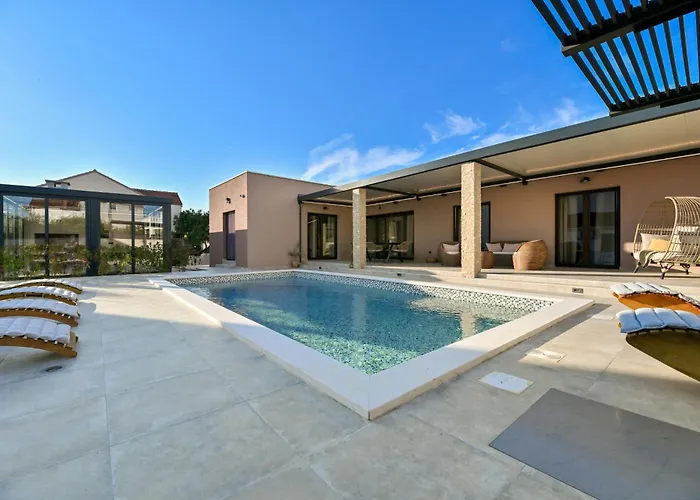Die 3-Zimmer-Villa Skyfall Bibinje liegt etwa 6 Fußminuten vom Strand Punta Rozica entfernt und verfügt über eine Terrasse mit Blick auf den Pool. Diese Villa strandnahe bietet einen privaten Swimmingpool und liegt 3 km vom Fährhafen Gaženica.